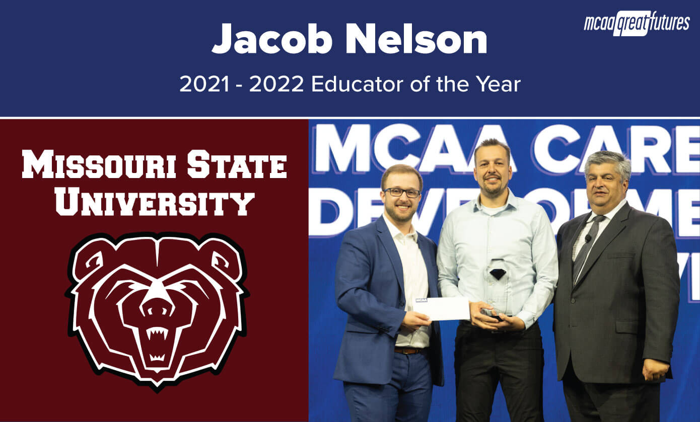The student chapter at Missouri State University proudly nominated Jacob Nelson for the MCAA 2021 Educator of the Year based on his mentoring, mechanical industry knowledge, chapter activity participation, and involvement and creation of student-focused networking opportunities with their local MCAA Chapter, MCA of Greater Springfield, Missouri.