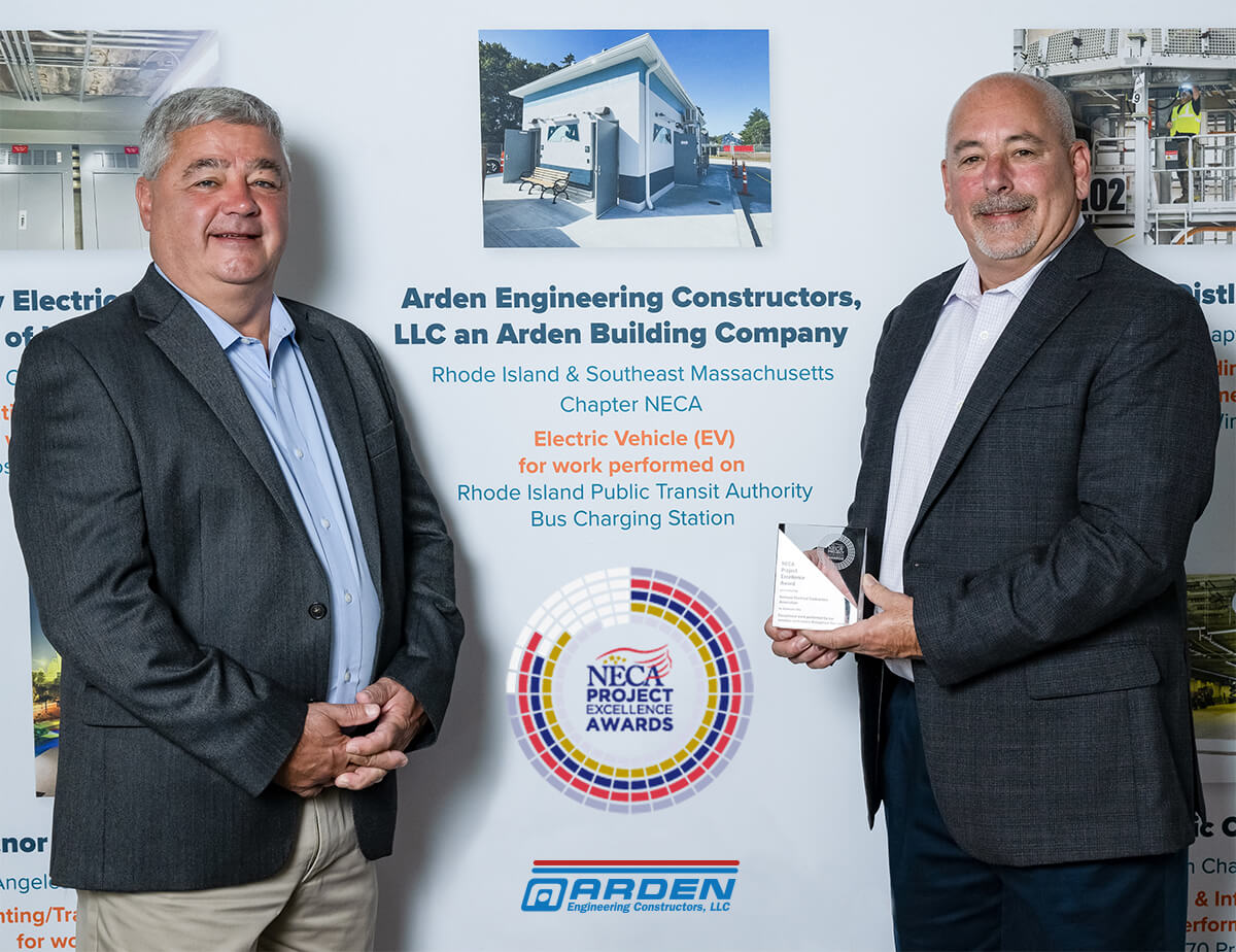 Arden Engineering Constructors (AEC), an MCAA member, received the 2024 Excellence Award from the National Electrical Contractors Association (NECA) for their work on the Rhode Island Public Transit Authority (RIPTA) Bus Charging Station. The new charging stations will efficiently charge RIPTA’s electric bus fleet and will benefit RIPTA’s busiest bus route, reducing emissions and greenhouse gases. AEC’s engineers designed and installed the charging system, which includes ABB E-mobility pantograph technology and a backup gas-fired generator. Additionally, AEC installed an underground radiant snowmelt system to keep the plaza driveway clear during winter months. Congratulations to the AEC team!