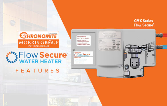 The Chronomite® Flow Secure® Water Heater features a solenoid valve that cuts off water and activates an alarm if a leak is detected, providing peace of mind. Chronomite is a Morris Group International brand.