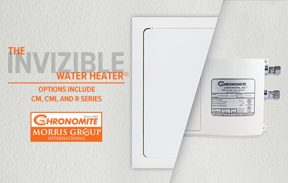 The Chronomite® InviZible® Electric Tankless Water Heater provides instant hot water, hidden behind an access panel, serving single or multiple lavatories. Chronomite is a Morris Group International brand.