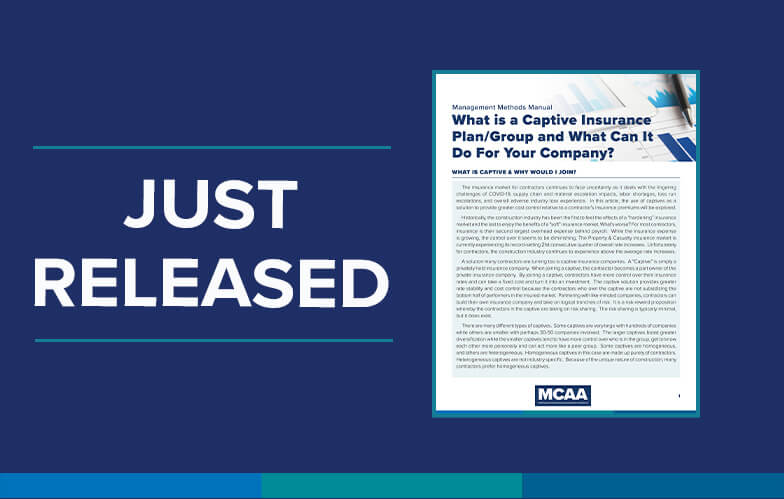 Mechanical contractors face an uncertain insurance market. MCAA’s new Captive Insurance Management Methods Bulletin explores the use of captive, or privately held, insurance as a way to mitigate risk and provide greater cost control relative to a contractor’s insurance premiums. It’s just one of MCAA’s educational resources that are free to MCAA members as a benefit of membership.
