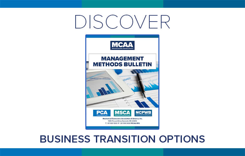 Each week, MCAA will highlight one or more of the educational resources that are free to MCAA members as a benefit of membership. This week, we focus on MCAA’s Business Transition Options for the Mechanical Contractor bulletin and podcast, which reviews the various options for transferring ownership of a company and showcases the advance planning and analysis needed for a successful transfer.