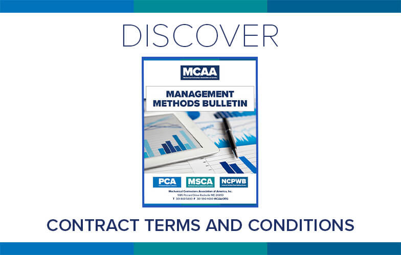 Contracts for mechanical construction and service work lay out the rights and obligations of each party. Mechanical contractors must carefully consider the types of terms and conditions that are appropriate for the given contract to minimize risk. MCAA’s Contract Terms and Conditions highlights 18 common terms and conditions that may be appropriate for inclusion in any contract as a starting point for each company’s independent discussions with their attorney and accountant. It’s just one of MCAA’s educational resources that are free to MCAA members as a benefit of membership.