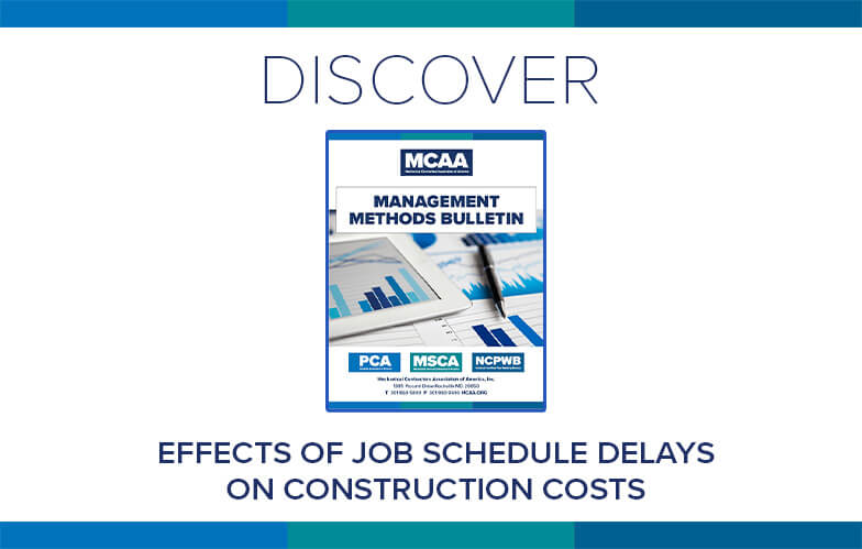 A study of mechanical and electrical projects conducted by MCAA and NECA showed that significant delays in construction and distortions in planned schedules cannot be anticipated in bids. When they occur, they have a devastating effect on construction costs, particularly labor. MCAA’s Effects of Job Schedule Delays on Construction Costs highlights the results of the study to help contractors understand the implications of project and schedule delay. It’s just one of MCAA’s educational resources that are free to MCAA members as a benefit of membership.