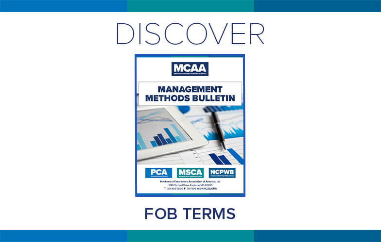 The shipping terms delineated in a mechanical contractor’s purchase order determine who assumes risk, claims, control and taxes. MCAA’s FOB Terms highlights the advantages and disadvantages of various shipping methods and terms to help contractors minimize liability and risk. It’s just one of MCAA’s educational resources that are free to MCAA members as a benefit of membership.