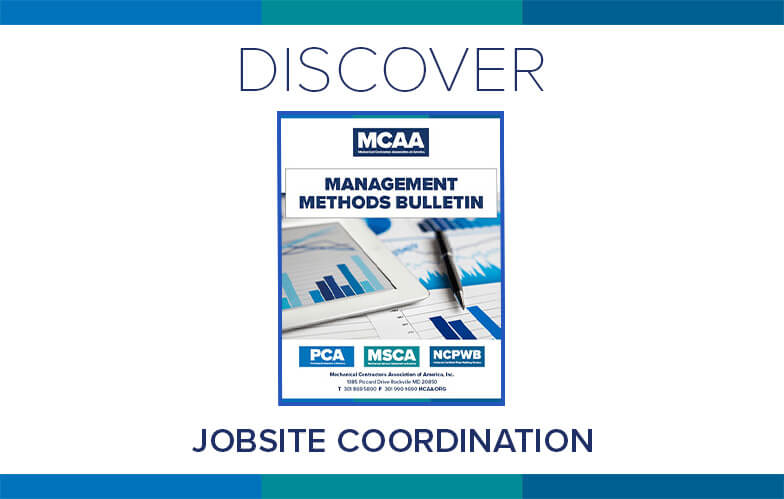 Mechanical contractors are likely to bear a large chunk of the responsibility for modern jobsite coordination. This can have cost implications that must be analyzed prior to making a bid. MCAA’s Jobsite Coordination highlights notable qualifications for discussion. It’s just one of MCAA’s educational resources that are free to MCAA members as a benefit of membership.