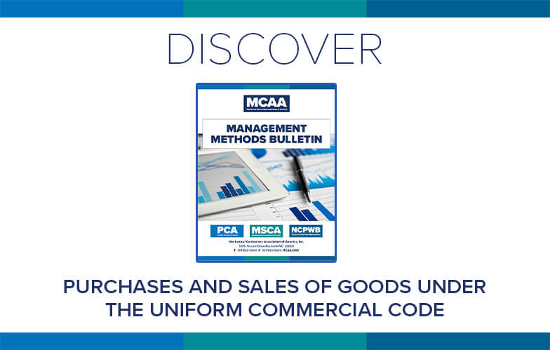 Mechanical contractors are likely to write purchase orders to material and equipment suppliers in other states. MCAA’s Purchases and Sales of Goods Under the Uniform Commercial Code reviews some of the principal provisions of the code governing these sales to help contractors analyze the adequacy of their forms and practices. It’s just one of MCAA’s educational resources that are free to MCAA members as a benefit of membership.