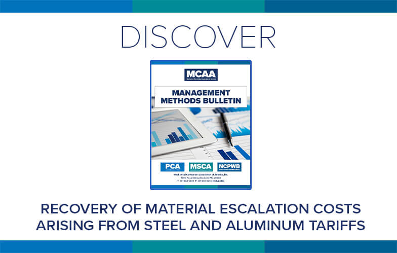 Unanticipated price escalations in construction materials after the contract is executed have caused concern to owners and contractors. MCAA’s Recovery of Material Escalation Costs Arising From Steel and Aluminum Tariffs addresses the approaches contractors may assert to recover under fixed priced contracts for the price increases resulting from new tariffs on imported steel and aluminum. It’s just one of MCAA’s educational resources that are free to MCAA members as a benefit of membership.
