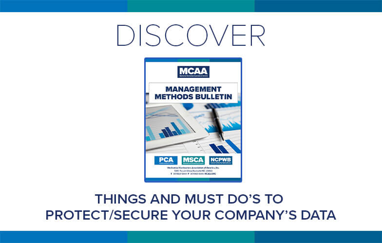Technology is changing every day, but the need to secure company data remains constant. MCAA’s Things and Must Do’s to Protect/Secure Your Company’s Data reviews the basic steps contractors should take to keep intruders out and company data secure. It’s just one of MCAA’s educational resources that are free to MCAA members as a benefit of membership.