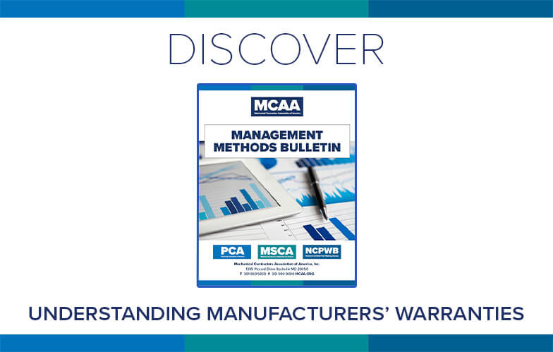 Standard manufacturers’ warranties can expose contractors to unexpected exposures. MCAA’s Understanding Manufacturers’ Warranties explains potential exposures and offers tips for minimizing them. It’s just one of MCAA’s educational resources that are free to MCAA members as a benefit of membership.
