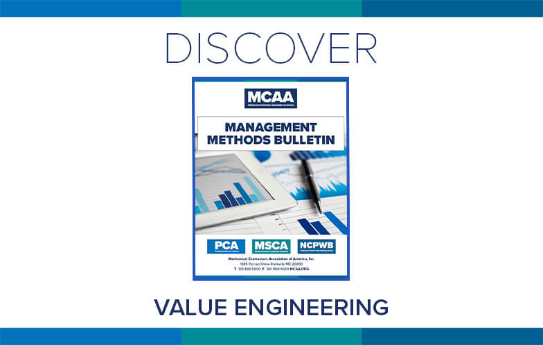 By participating in team-oriented value engineering, mechanical contractors can provide an invaluable service to their clients, thus increasing their value and competitive advantage. MCAA’s Value Engineering explains this approach to optimizing value for each dollar spent to prepare contractors to effectively participate in the process. It’s just one of MCAA’s educational resources that are free to MCAA members as a benefit of membership.