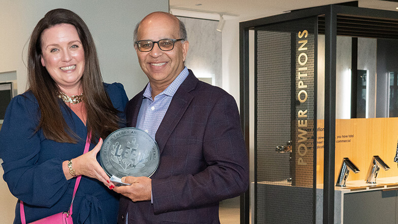 Rhiannon Jacobson, USGBC managing director, presented the plaque to Parthiv Amin, Sloan’s chief sales and marketing officer. The venue is the world’s first commercial plumbing showroom to be both LEED and WELL certified.