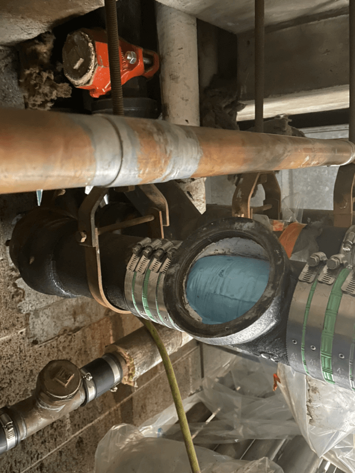 To address fittings, the team employed a combination of the “gap” method and mechanical reinstatements. Using a pull-in-place technique, liners were precisely installed to start or stop at each fitting, overlapping the joints, leaving a gap to preserve the branch connection. This method is ideal when access to the branch is not possible for immediate reinstatement, allowing for future rehabilitation with a specialized “connection” liner when the property is ready for that phase. Additionally, approximately 30 prelined 4” cast iron cleanouts were installed to facilitate ongoing cleaning and maintenance. This approach minimized disruptions, enhanced system reliability, and ensured smooth transitions between lined and unlined sections.