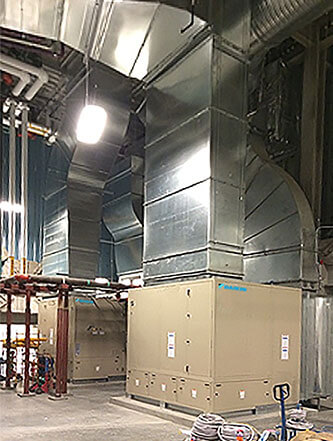 ACCO installed the sheet metal, piping, and HVAC systems, maintaining cleanliness in compliance with indoor air quality standards for LEED certification. Daikin worked closely with ACCO by providing 3D CAD files of the 100-ton water-cooled Self-Contained AC units to assist with the modeling of the equipment rooms, ductwork, and piping systems. The modeling and design efforts made for a smooth installation process.