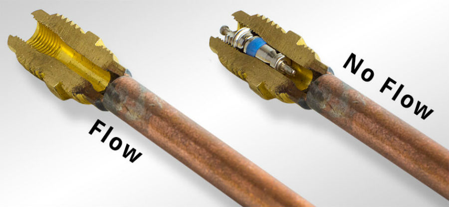 During refrigerant recovery, 1/4″-diameter charging hoses are effectively capillary tubes, greatly reducing flow and potentially causing trouble throughout the process. Quick-disconnect and auto-shutoff hose fittings incorporate valve mechanisms that not only restrict the flow of refrigerant but can act as a metering device during liquid recovery, leading to other problems such as overheating tanks. Using hoses equipped with ball valves meets the Environmental Protection Agency’s (EPA’s) low loss fitting requirement while ensuring full refrigerant flow during the recovery process.