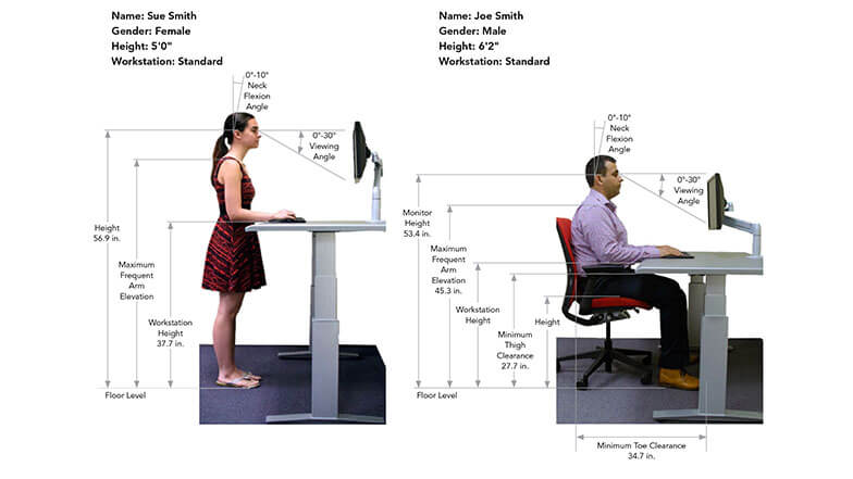 - Provide height-adjustable work surfaces with keyboard trays that will fit both sitting and standing users.