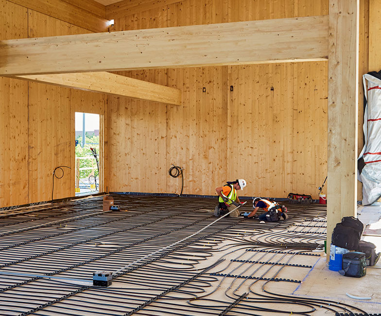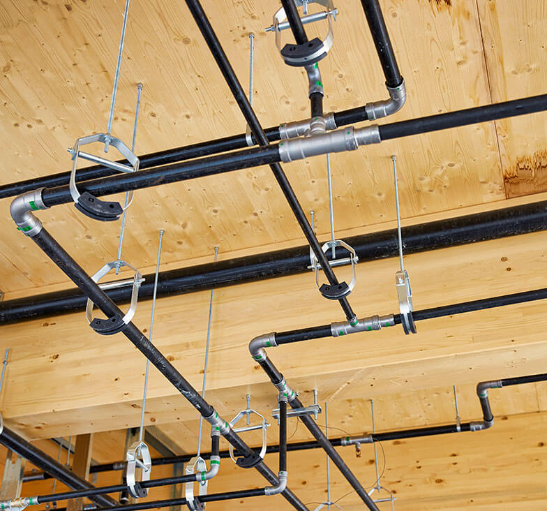 MegaPress connects the fire sprinkler system, and MegaPressG fittings were used on the natural gas lines. “Especially with this being a big wooden structure (the buildings are filled with cross-laminated timber), not having open flames involved in the process of putting the pipe together is a big bonus,” Stone added. “Plus we don’t have areas to protect from the mess of welding and soldering.”