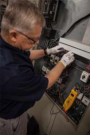 Gary Coulson, a senior HVAC technician for Brandt, uses a clamp meter to check electrical circuits. Connect from KEY2ACT lets Brandt turn data from buildings and equipment into action, pinpointing potential problems before they occur.