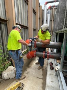 General Piping’s Jason Miller (left) and Newt Briar installed NIBCO’s #GD4765-5 grooved butterfly valve with a gear operator on the exterior chilled water piping that feeds the high school’s new air-cooled chillers. The ease of installing the NIBCO products helped General Piping stay within the narrow window for completing the cooling system.