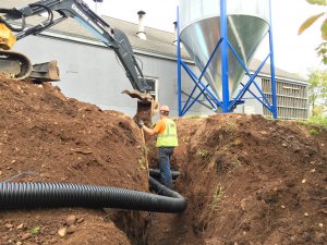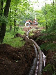 The Ecoflex pipes came in long coil lengths up to 600’, which meant the installers did not need to stop often to make connections. They used a large uncoiler to lay the pipe in the trench efficiently in just one week.