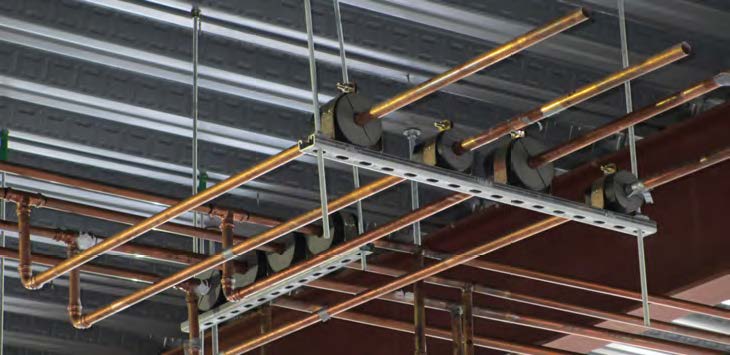 For the office building, Vranich said his process has been to prefabricate the copper racks in the shop and then ship the racks to the jobsite. “CADDY ROD LOCK is inserted into the strut, and once onsite, we lift the racks in place with some expected labor savings. The entire project includes about 350 racks of pipe.”