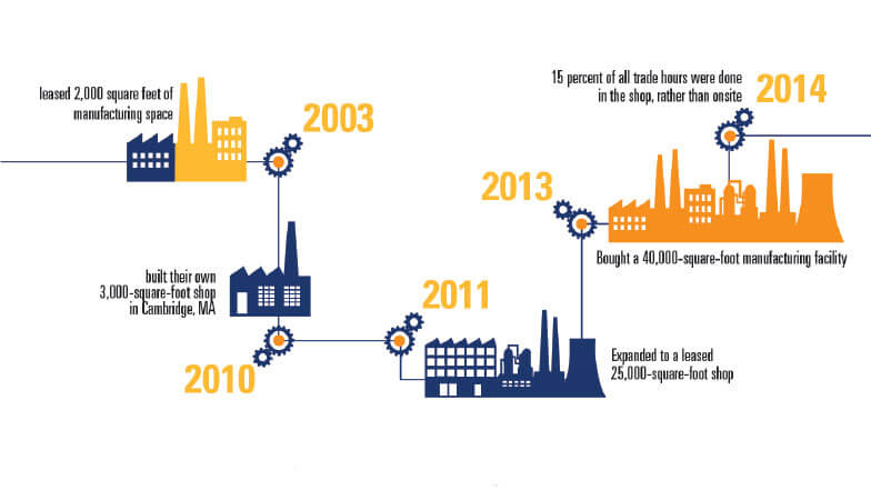 To meet these challenges, TG Gallagher developed a strategy around prefabrication, manufacturing and assembling as much as possible offsite, then delivering the products for installation. The company has been investing in prefabrication for 15 years. In 2003, they leased 2,000 square feet of manufacturing space while building Massachusetts General Hospital’s Yawkey Center. By 2010, they had built their own 3,000-square-foot shop in Cambridge, MA. By 2011, they had expanded to a leased 25,000-square-foot shop. Finally, in 2013, they bought a 40,000-square-foot manufacturing facility. By 2014, 15 percent of all trade hours were done in the shop, rather than onsite.